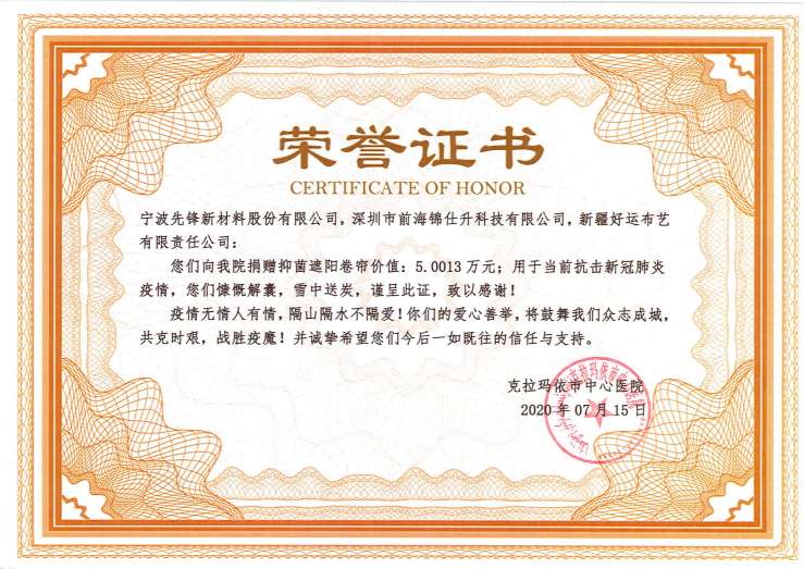 深圳市前海錦仕升科技有限公司、寧波先鋒新材料股份有限公司和新疆好運(yùn)布藝有限責(zé)任公司的代表在捐贈(zèng)儀式上表示:“面對(duì)疫情,我們深知醫(yī)療前線人員的不易,也深知醫(yī)療資源的寶貴。作為企業(yè),我們有責(zé)任也有義務(wù)為疫情防控貢獻(xiàn)一份力量。這批抑菌遮陽卷簾是我們對(duì)醫(yī)護(hù)人員辛勤付出的致敬,也是對(duì)全社會(huì)共同抗擊疫情的堅(jiān)定支持?!?/p>